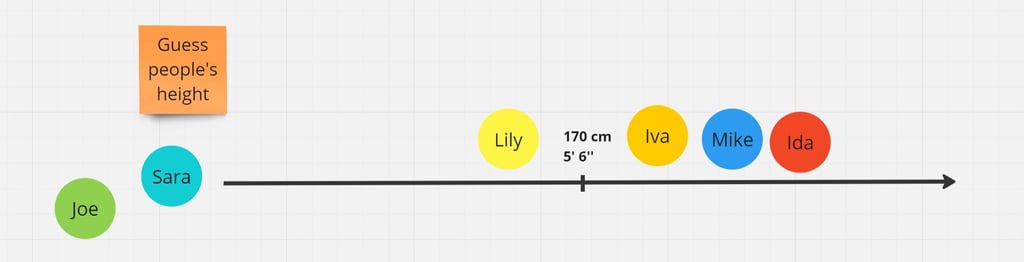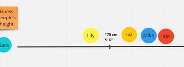 2 . Guess your team members’ height. Ask your teammates to position the other team members according to how tall they are. Split your team members into smaller groups, either in a breakout session, small remote locations they’re in, or in a chat. The idea here is that they are not silently sitting at their desks and positioning the cursor wherever; otherwise, it is not an interactive and immersive experience with your team. Ensure they are talking out loud about what they’re thinking or some experiences they might have had if they had met before. This is a funny exercise, as you might have been working with this person for hours on end per day, but you have no idea how their height, an obvious element if you were together, might be.