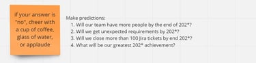 Go back to the “make predictions” questions and instruct your team to make a cheer with a coffee cup, applaud, or make noise if the answer is “no” (alternatively with the answer that makes the most sense to cheer for).